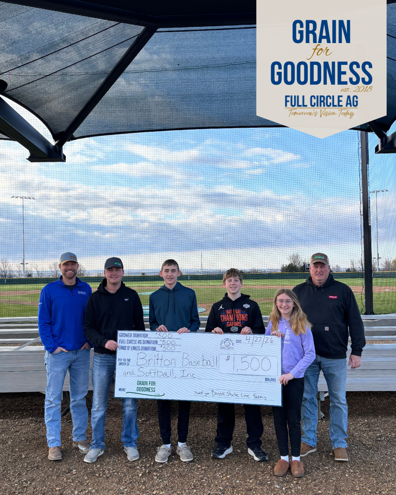 Through our Grain for Goodness program, we were proud to partner on a recent donation benefiting the Britton Baseball program. This donation was made possible by Bosse State Line Farms, who contributed $500 worth of grain through the Grain for Goodness program. We matched their donation dollar for dollar, and Land O'Lakes once again matched ours, resulting in a total contribution of $1,500 to the Britton Baseball program!